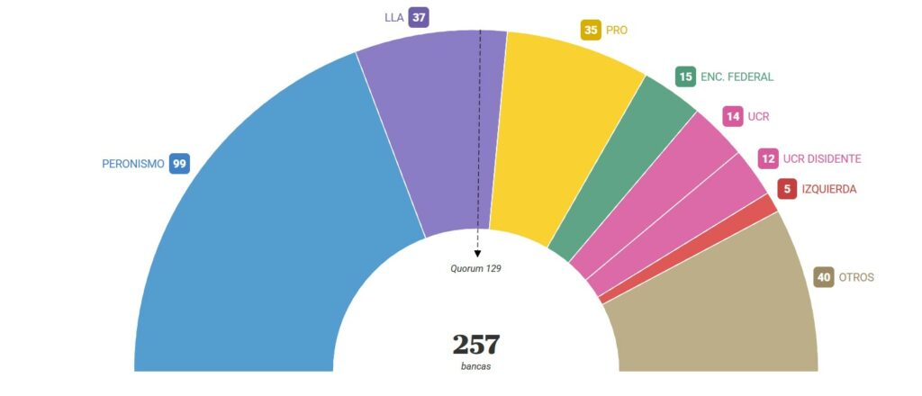 Ci-dessous, la projection en sièges, lundi matin, donnée par le quotidien La Nación. La majorité absolue est de 129 sièges. On remarquera donc que personne ne l’obtient, bien sûr, et qu’en sièges, les péronistes restent donc les plus nombreux. Mais Milei pourra compter sur les 24 députés du PRO (droite classique) pour des alliances ponctuelles, et il ne manquera pas de faire pression sur ceux des «Provinces unies» (liste protestataire portée par des gouverneurs de provinces et qui a largement échoué à ces élections) pour les obliger à avaliser certains de ses projets. On notera également la persistante inexistence de la gauche argentine, créditée ici de seulement 4 sièges. Quant à l’UCR, Union civique radicale, ancien parti qui a dominé la vie politique argentine pendant des décennies (c’était celui notamment du président Raúl Alfonsín, premier président élu après la dictature militaire), il disparait peu à peu du paysage. L’écologie politique, elle, n’est même pas encore dans le ventre de sa mère !