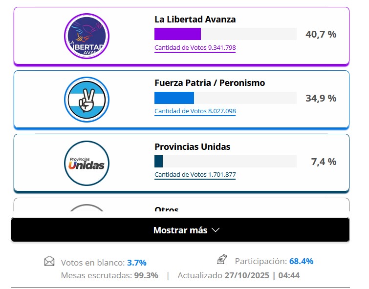 En fait de mauvais résultats : une victoire nette et sans bavures, ou presque. 40,7%, 9 points devant l’opposition péroniste, créditée de moins de 35 %. Le plus beau : même dans la province de Buenos Aires, pourtant nettement perdue 47 à 33 lors des élections régionales de septembre, LLA devance les péronistes, en obtenant 7 sièges de députés sur 13.